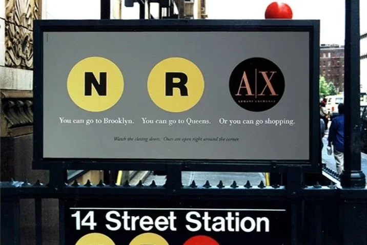 We distilled that essence to its most elemental form—the nuts and bolts of style. From that idea, everything followed naturally. The concept was not about luxury stripped down, but about simplicity elevated; not about cost, but about clarity. Mr. Armani immediately connected with the nut and bolt as a symbol—it perfectly expressed his “basics” philosophy of jeans and T-shirts, and it quickly became the icon of the brand, appearing on banners, T-shirts, and even as nut-and-bolt earrings designed by Mr. Armani himself. The creative system extended this purity of design across every touchpoint: black-and-white advertising that felt bold and essential, the first introduction of color in a natural, everyday setting—a farmer’s market—reflecting authenticity over artifice. Out-of-home media treated the brand as a subway line, connecting fashion to the pulse of the street. Packaging came in a stylish brown bag, simple yet unmistakably designed. Every element—from the logo to signage and collateral—followed the same philosophy: the elegance of Armani reduced to its structural essentials.
